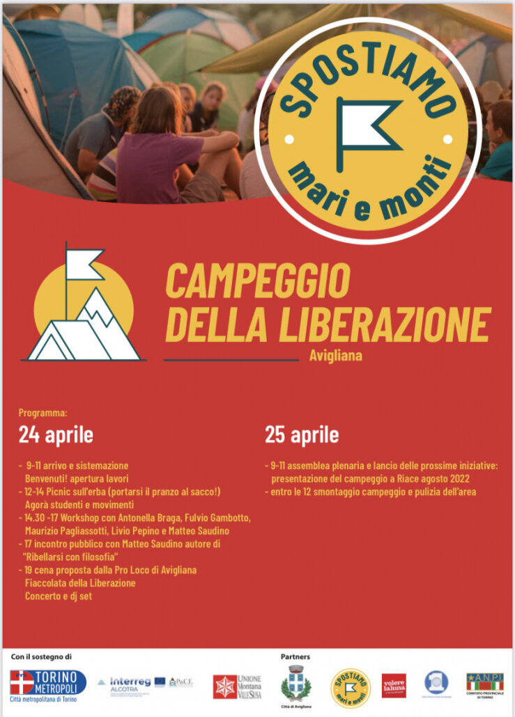 Il Campeggio della Liberazione, previsto ad Avigliana il 24 e 25 aprile, è realizzato con il supporto di Città Metropolitana di Torino, Unione Montana Valle Susa e Città di Avigliana e in collaborazione con Volere la luna odv, ANPI comitato provinciale di Torino e CESI, si articolerà in momenti di attività di formazione del gruppo di partecipanti e conoscenza del territorio ospitante; momenti di confronto formativi/laboratoriali di approfondimento dei temi con diversi esperti e ospiti tra cui il professore di filosofia e scrittore Matteo Saudino, l’ex magistrato Livio Pepino, la studiosa del pensiero antifascista Antonella Braga, lo scrittore e giornalista Maurizio Pagliassotti, il professor Fulvio Gambotto, membro dell’ANPI provinciale; partecipazione a momenti aggregativi e ad attività proposte dalle realtà territoriali, in primis alla fiaccolata prevista la sera del 24 aprile; per concludere musica e tanta voglia di ballare con un concerto che ospita, tra gli altri, i musicisti di Spazio X (un laboratorio musicale del territorio ) e Luca Vicini e a seguire un dj set.