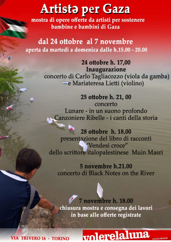 La mostra, con esposizione di opere offerte daartistǝ a sostegno delle bambine e dei bambini di Gaza, resterà aperta sino al 7 novembre (orari: dal martedìalla domenica, ore 15.00-20.00). Nel corso della mostra sono previsti concerti di Lunare e Canzoniere ribelle (25 ottobre, ore 21.00) e Black notes on the river (5 novembre, ore 21.00) e la presentazione del libro