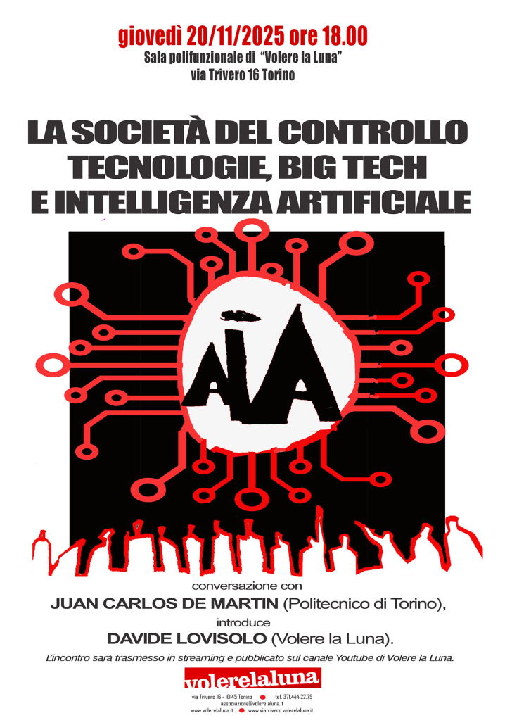 “LA SOCIETÀ DEL CONTROLLO. TECNOLOGIE, BIG TECH E INTELLIGENZA ARTIFICIALE” conversazione con JUAN CARLOS DE MARTIN (Politecnico di Torino), introduce DAVIDE LOVISOLO (Volere la Luna). L’incontro sarà trasmesso in streaming e pubblicato sul canale Youtube di Volere la Luna.