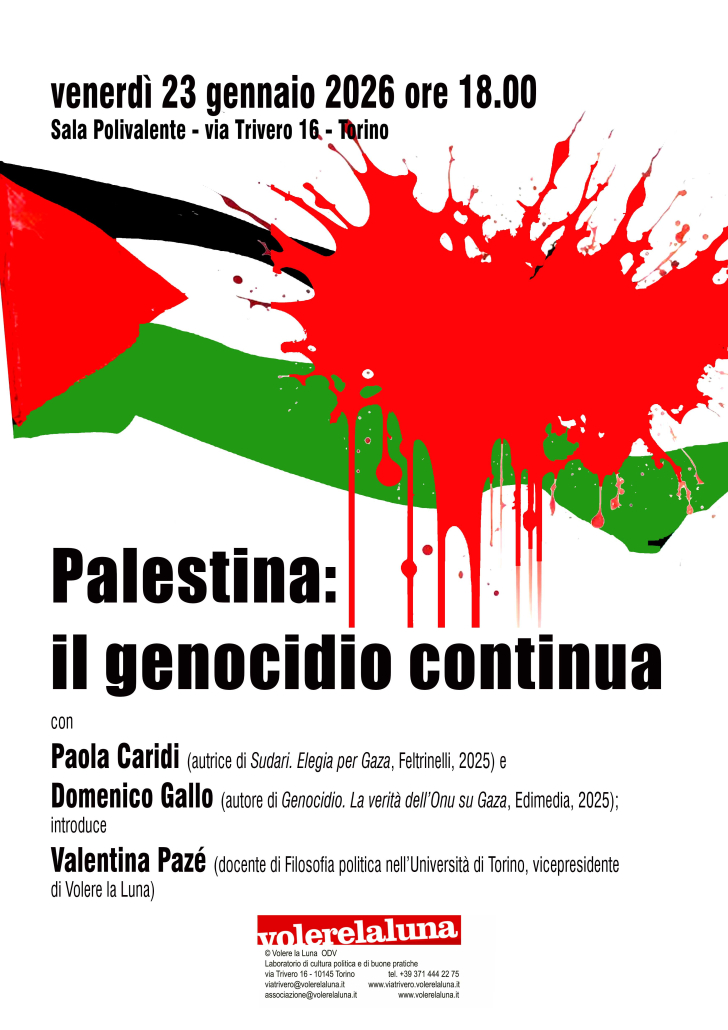 con Paola Caridi (autrice di Sudari. Elegia per Gaza, Feltrinelli, 2025) e Domenico Gallo (autore di Genocidio. La verità dell’Onu su Gaza, Edimedia, 2025); introduce Valentina Pazé (docente di Filosofia politica nell’Università di Torino, vicepre-sidente di Volere la Luna)